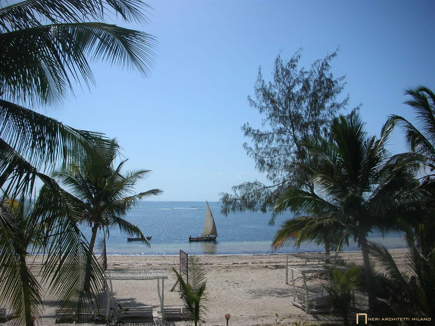 Un progetto unitario dalla planimetria articolata. Un importante portale, contornato da cascate e alte palme, funge da ingresso alla struttura; da questo, una scala conduce al percorso centrale dove si affacciano le varie costruzioni. Lunghe vasche d’acqua, a segnare il percorso verso il mare, fungono da filo conduttore del progetto.